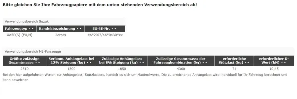 Verstärkte Anhängerkupplung, abnehmbar, inklusive Gutachten zur Anhängelasterhöhung auf max. 1850 kg Anhängelast (je nach Typ, Verwendungsbereich beachten). Im Lieferumfang ist kein E-Satz enthalten, nutzen Sie hierzu unser Zubehörsortiment. Eine TÜV-Abnahme ist notwendig.