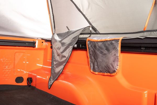 The Gladiator Truck Tent by Rightline Gear lets you continue the adventure by providing a comfortable and dry place to crash after a long day on the trails. The easy to set up tent is made from durable 2000mm water-resistant fabric that incudes tape sealed seams to keep out the elements. The floorless design allows for a quick setup without the need to remove any gear from the bed of the vehicle. This roomy tent features 2 gear pockets to hold a cell phone or small personal belongings, a hook for hanging a light, a sky-view vent, and glow in the dark zipper pulls so you won't fumble around to get in or out of the tent. The attachment points are located on the exterior of the Jeep, and setup takes just a few minutes with no modifications necessary to your Gladiator JT. All of the necessary hardware is included.