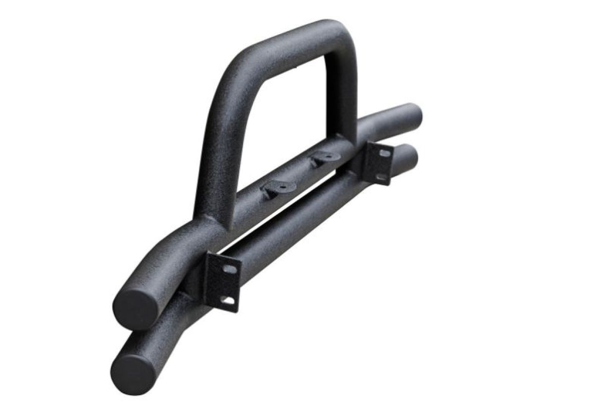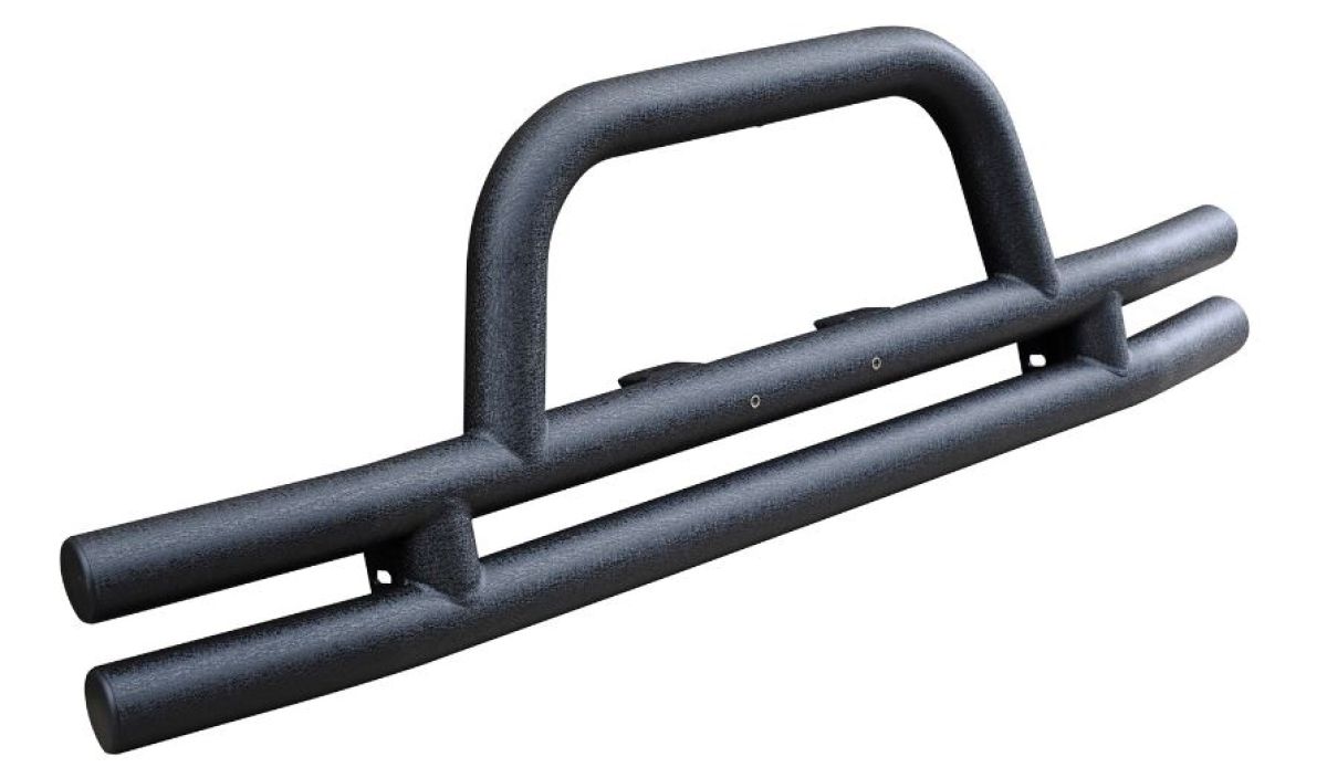 Schwarzestrukturierte, aus Baustahl gefertigte, bullige Doppelrohrfrontstoßstange im "Black Rock" Design. Die robusten, stabilen Rohre,mit einem Ø 76mm verleihen Ihrem Jeep Wrangler JL nicht nur einen aggressiven Look, sondern bieten auch zusätzlichen Schutz. Die Montage erfolgt an den vorhandenen Befestigungspunkten ohne zu bohren. Die bereits angeschweißten beiden Laschen an der Stoßstange ermöglichen die Montage von Zusatzscheinwerfern oder einer Lightbar. Die Stoßstange verfügt auf der Vorderseite über zwei Aufnahmen zur Montage einer Kennzeichenhalterung.
